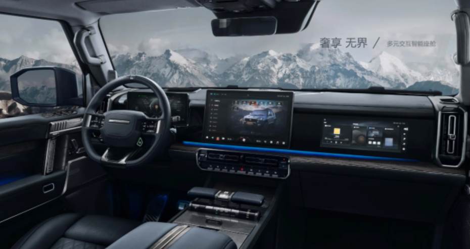 The interior of the car adopts a three screen design. Although the appearance is rugged off-road, the technological style inside is very unique. It not only has a full LCD driving computer screen, but also a passenger entertainment screen.
